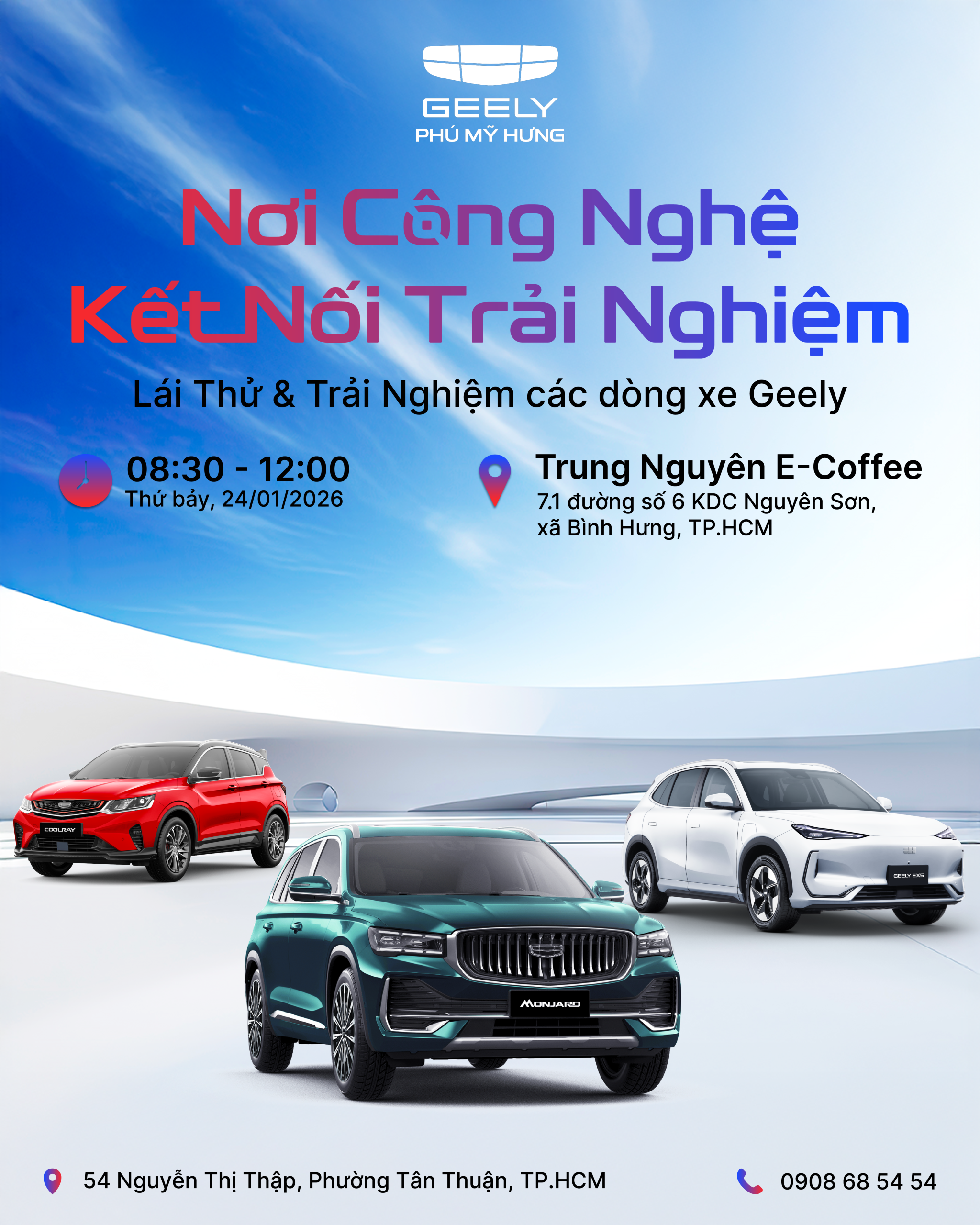 Cuối tuần này, Geely Phú Mỹ Hưng trân trọng kính mời Quý khách tham dự sự kiện lái thử & trải nghiệm các dòng xe Geely trong không gian cà phê sang trọng, thư giãn của Trung Nguyên E-Coffee.