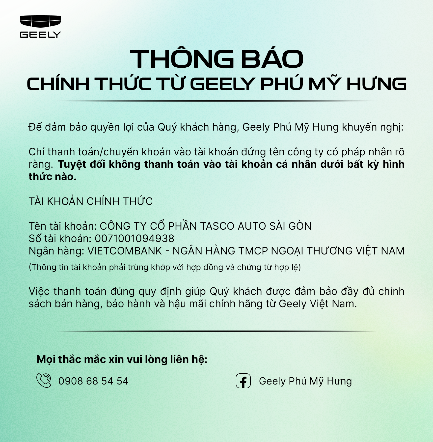 Mọi thắc mắc về tài khoản thanh toán hoặc hệ thống đại lý ủy quyền, vui lòng liên hệ trực tiếp fanpage chính thức của Geely Phú Mỹ Hưng hoặc hotline 0908 68 54 54 để được hỗ trợ.